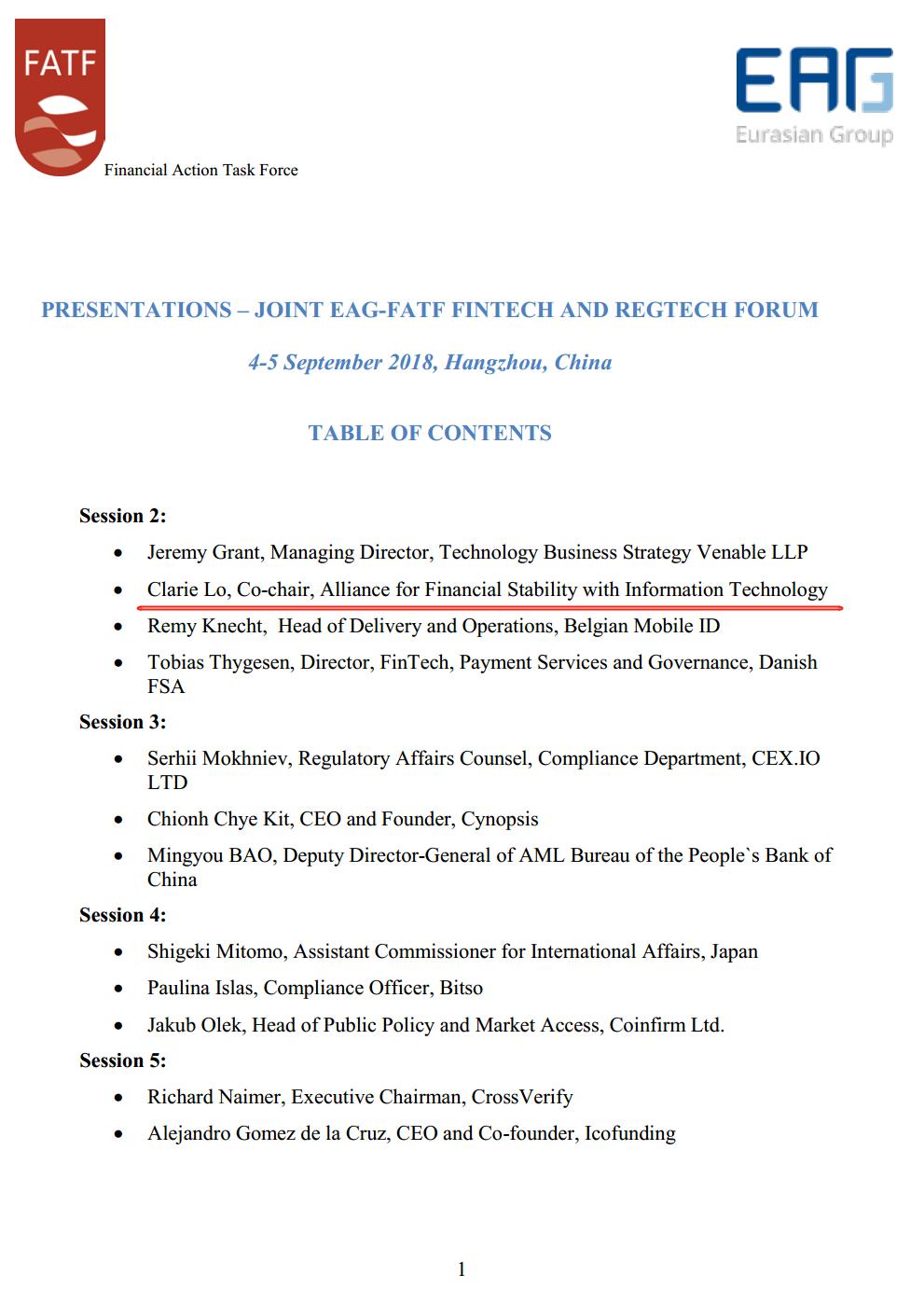 2018年9月4-5日,反洗錢金融行動特別工作組(FATF)以及歐亞打擊洗錢和反恐融資小組(EAG)在中國杭州舉辦的 “金融科技與監管科技”論壇,金融安全發展聯盟代表出席並就主題作出發言,介紹聯盟宗旨及KYC標準的指導原則,與FATF建立合作關係, 論壇上,金融安全發展聯盟與國際貨幣基金組織(IMF)初次接觸, 並開展計劃雙方的進一步合作。